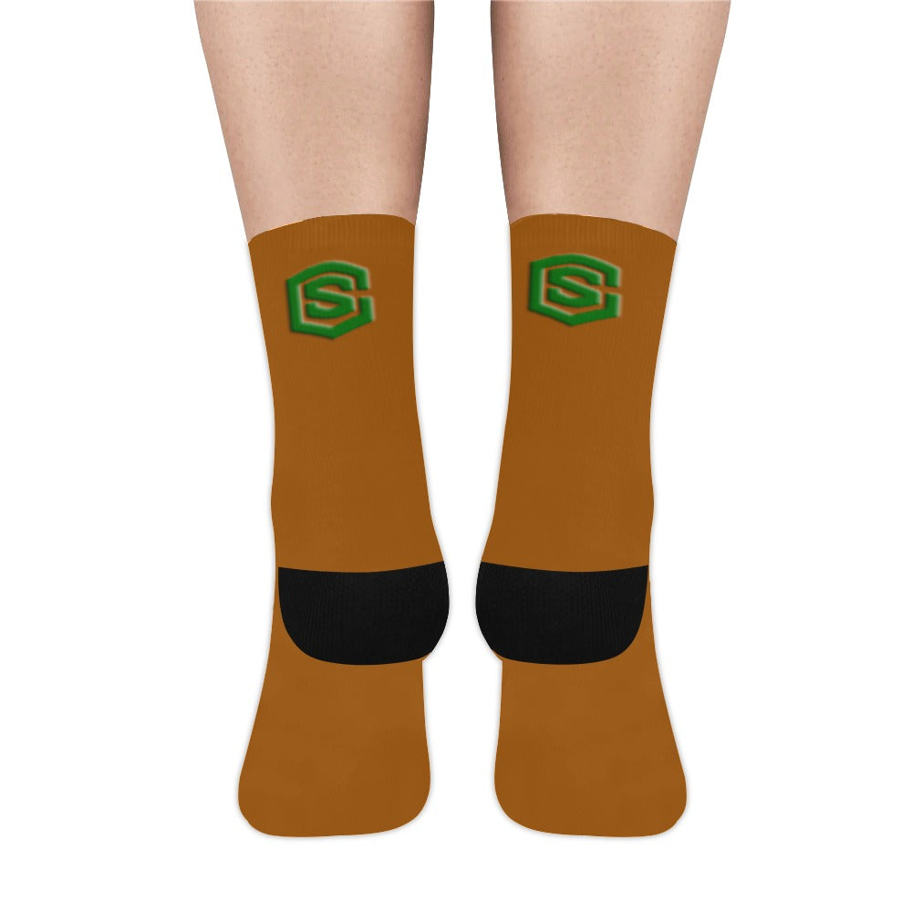 Brown Sublimated Crew Socks (Made In USA) with Green Logo Sublimated Crew Socks (Made In USA)