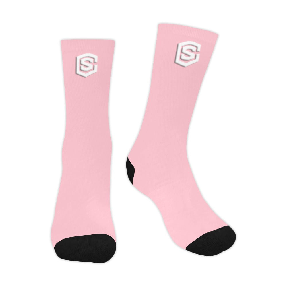 Pink Sublimated Crew Socks (Made In USA) with White Logo Sublimated Crew Socks (Made In USA)