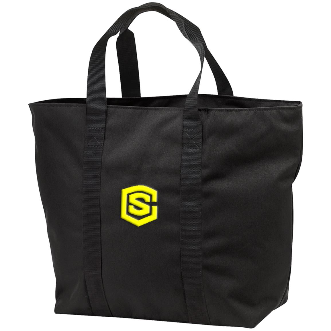 - Zippered opening and front pocket; tote is embroidered above pocket